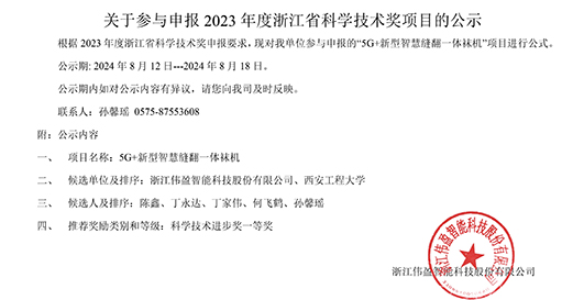 根據(jù) 2023 年度浙江省科學(xué)技術(shù)獎(jiǎng)申報(bào)要求,現(xiàn)對(duì)我單位參與申報(bào)的“5G+新型智慧縫翻一體襪機(jī)”項(xiàng)目進(jìn)行公式。